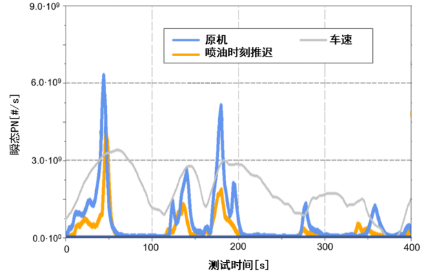 ■ 圖4 基于活塞表面溫度的最優化噴油時刻策略對于冷機負荷突變工況下PN排放的改善效果