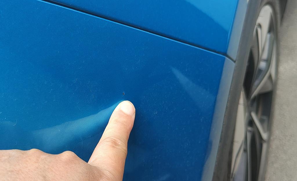 再次來到西安灃東新城極狐中心,看到這輛極狐阿爾法T之后,車叔真的略感震驚。原本不到米粒大的損傷倒是重新噴漆了,但在有限的噴漆面上,極狐中心的售后居然噴出了一大堆沙眼。這里大家可以看看下面這組維修后的實拍圖,由于角度問題還有一些沙眼并不太容易看到,但是在特定的光線、角度下還是非常明顯的。