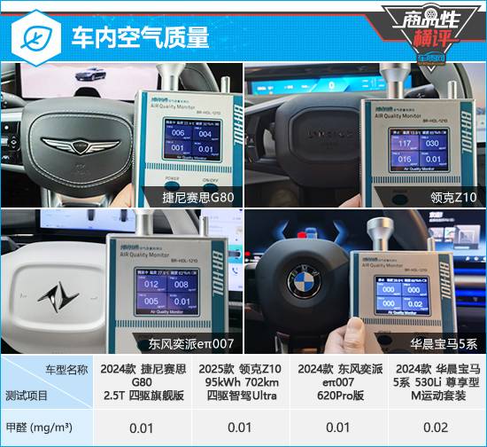 在車內(nèi)空氣質(zhì)量測(cè)試中,四款車的車內(nèi)甲醛含量均控制在合理范圍內(nèi),符合2012年3月1日起實(shí)施的,由原環(huán)保部和國(guó)家質(zhì)量監(jiān)督檢驗(yàn)檢疫總局聯(lián)合發(fā)布的《乘用車內(nèi)空氣質(zhì)量評(píng)價(jià)指南》(中華人民共和國(guó)國(guó)家標(biāo)準(zhǔn)GB/T 27630-2011)中的相關(guān)標(biāo)準(zhǔn)。