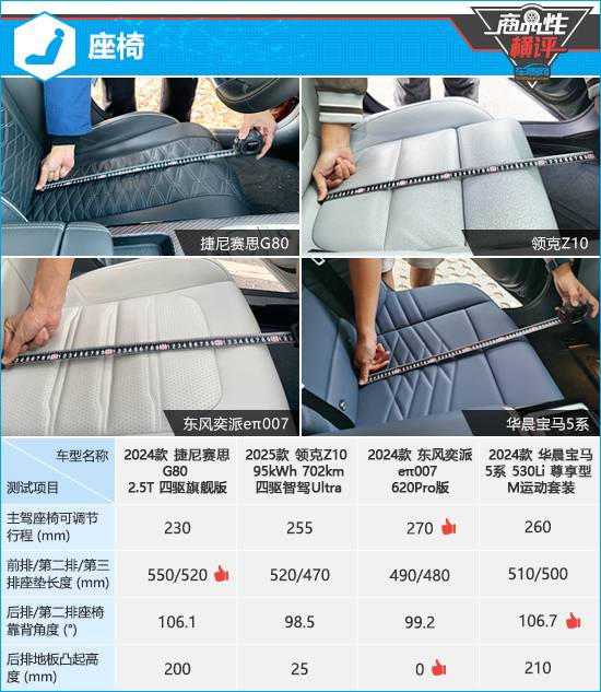 座墊長(zhǎng)度方面,捷尼賽思G80的前后排座椅座墊長(zhǎng)度均達(dá)到同級(jí)別上游水平,能夠提供充足的腿部支撐。相比之下,領(lǐng)克Z10的后排座椅座墊長(zhǎng)度略短,駕乘人員長(zhǎng)時(shí)間乘坐容易產(chǎn)生疲勞感。