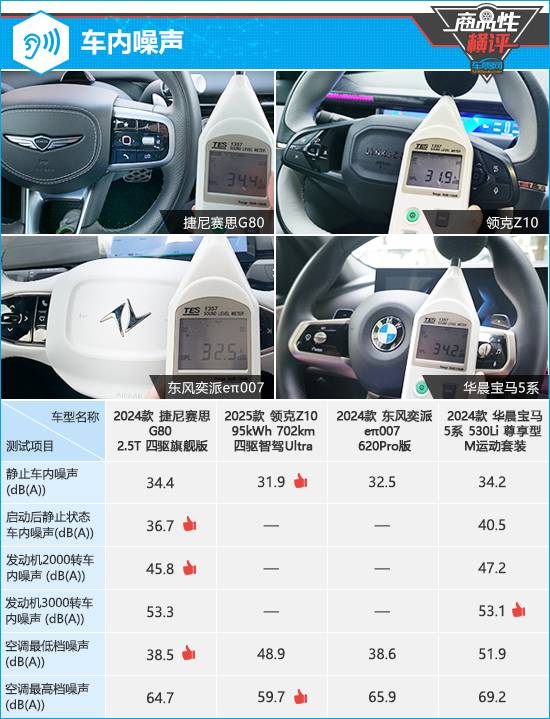 在空調(diào)最低檔噪聲方面,捷尼賽思G80和東風(fēng)奕派eπ007測(cè)試數(shù)值相差不大,前者以微弱優(yōu)勢(shì)取勝。至于空調(diào)最高檔噪聲,則是領(lǐng)克Z10表現(xiàn)相對(duì)更好。