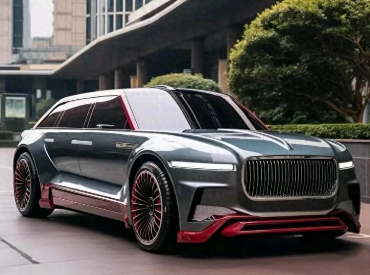 上圖給我的感覺既像賓利,又像奧迪RS系列,營造出一種運動奢華的既視感。在顏色搭配上,該車的下格柵、前唇、側裙和A柱采用紅色飾板或飾條點綴,算是“雙色車身”的一種表現形式,顯得十分個性。它的中網采用大面積的“直瀑式”銀色飾條點綴,大燈組很狹長,兩側進氣口設計了“風刃”造型,擁有更好的空氣動力學效果。前引擎蓋上還有三道隆起的筋線,讓前臉充滿力量感。另外,我沒有看到它的外后視鏡,連電子外后視鏡都沒有,這一點十分讓人意外。