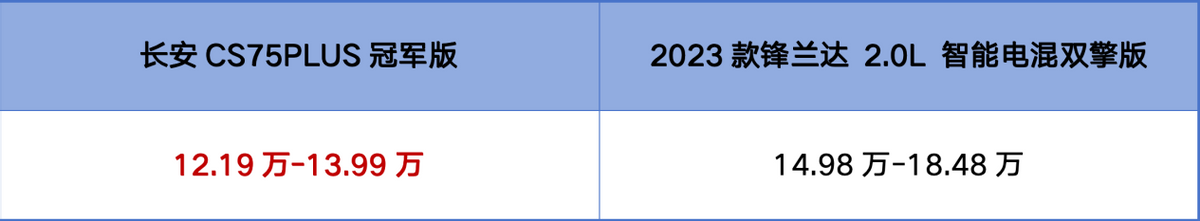 鋒蘭達這邊,為了加入中國新能源汽車的賽道,今年4月推出了2.0L 智能電混雙擎版,四款配置車型整體官方售價為14.98萬-18.48萬,其門檻價比長安CS75PLUS冠軍版高了2.79萬元,相當于貴出了再買一臺微型車的錢。
