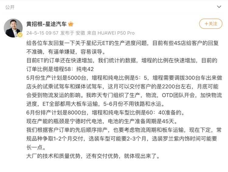 截至5月11日中午,星紀元 ET訂單超過26000臺。5月15日,星途黃招根在社交媒體表示,ET的訂單還在快速增加,增程和純電的比例是58:42。5月份生產計劃是5000臺,6月排產計劃是8000臺,產能瓶頸是寧德時代電池,電池的生產準備周期是45天。
