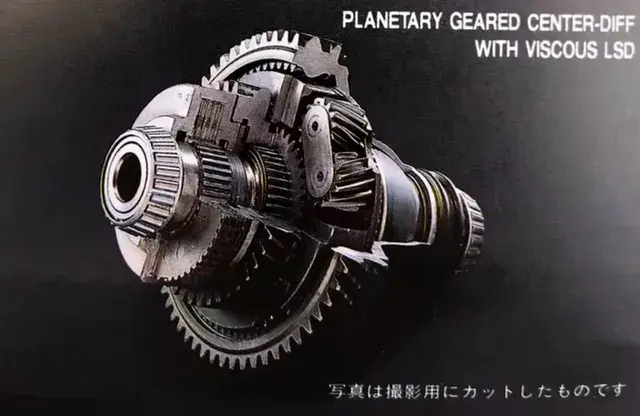那個年代,四輪驅動還是以縱向發動機布局為主,動力經過變速箱再經過中央差速器,然后再傳遞到前后軸。要想基于橫向發動機布局實現四輪驅動,中央差速器的布局成為了難題。馬自達323 GT-R這套全時四驅系統精妙的地方就是采用行星齒輪純機械結構,中央差速器可在43:57至60:40之間無級切換前后軸動力,同時還配有黏性聯軸器,以及電控差速鎖。