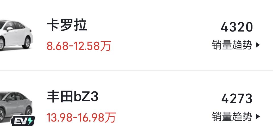 這款豐田電動(dòng)車的銷量已經(jīng)和卡羅拉差不多了,沒錯(cuò),就是這款剛上市就被罵到差點(diǎn)退市的豐田bZ3,在今年的4月份賣了4273輛,而卡羅拉才賣了4320輛。現(xiàn)在買豐田的油車還算可以理解,圖個(gè)省油耐用,但是買豐田的電車圖啥呢,定價(jià)這么貴,用的還是比亞迪的電芯,名字還這么奇葩。