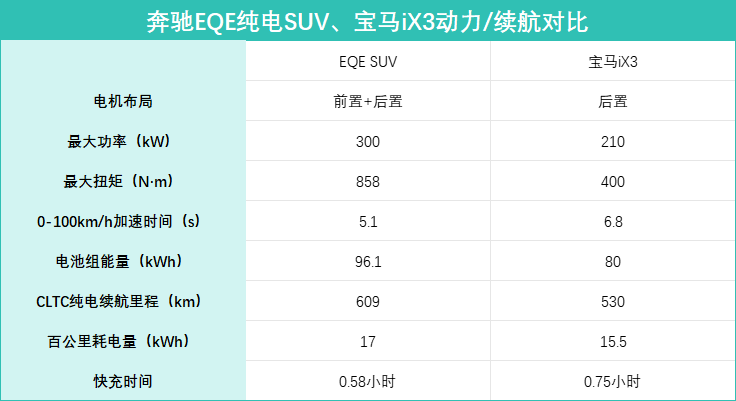 續航方面,EQE SUV配備了96.1kWh的電池組,且整車CLTC純電續航里程可達609km;寶馬iX3配備了80kWh的電池組,其CLTC純電續航里程為530km,前者會有明顯優勢。能耗方面,得益于0.25Cd的風阻系數,以及熱泵空調、BMS自研電池管理系統等技術,EQE SUV的百公里耗電量也僅為17kWh,對于一臺5.1秒破百的中大型SUV而言,能耗還是蠻低;