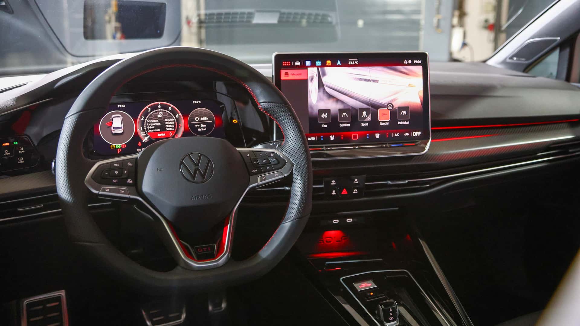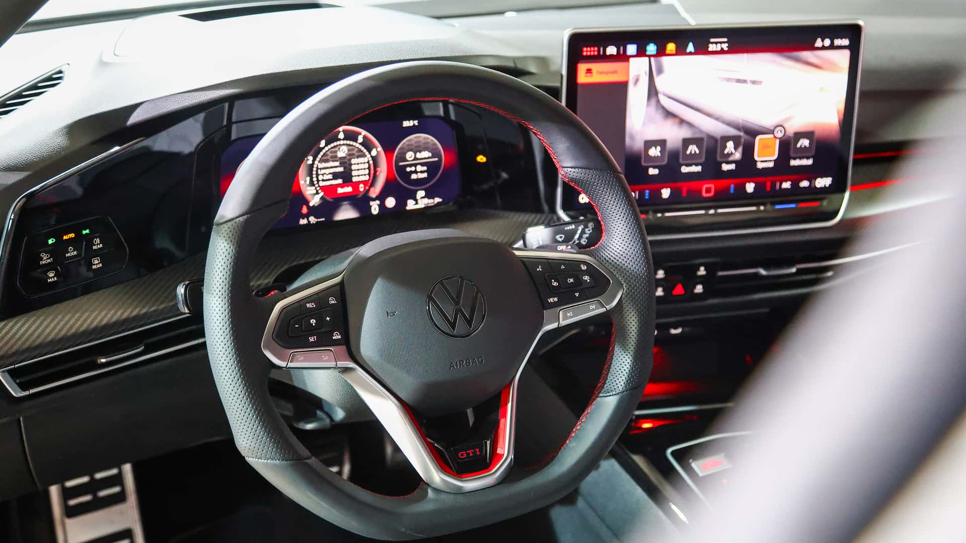 在內飾部分,新車當然也是新款GTI的那一套,中控懸浮式大尺寸液晶屏有了全新的車機,與界面經過升級的儀表盤組成雙屏系統,中控向駕駛的偏轉,加入了大面積碳纖維的覆蓋,方向盤也有著特質的打孔樣式,配合打孔運動座椅,獨特的撞色設計,醒目的GTI標識,有著充沛的戰斗感。