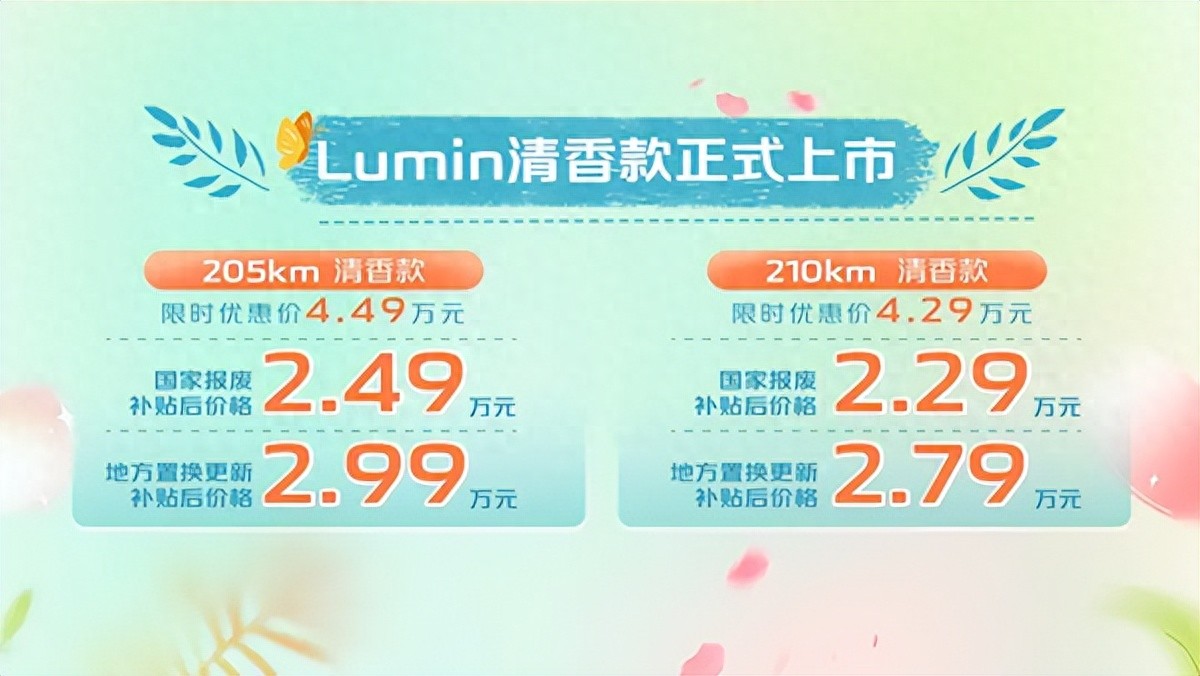 210km版本限時優惠價為4.29萬元,下訂即享2000元廠家限時優惠,享受國家報廢補貼2萬元后,指導價低至2.29萬元,若享受地方置換補貼1.5萬元,指導價為2.79萬元。