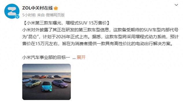 12月9日,據“ZOL中關村在線”報道,小米汽車的第三款車型代號“昆侖”,將采用增程式動力系統,預計售價15萬元左右。