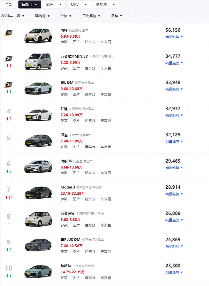 從11月轎車銷量榜的表現來看,比亞迪依然是大贏家,旗下四款車型進入TOP10,僅次于比亞迪的則是五菱品牌,旗下兩款車型也有不錯的銷量表現,除了新能源車型之外,燃油車陣營中也有多款車型上榜,而驅動其銷量增長的主要原因便是降價促銷,后期隨著競爭日益加劇,預計前十名車企的排名還將有較大的變化,不知道你怎么看呢?
