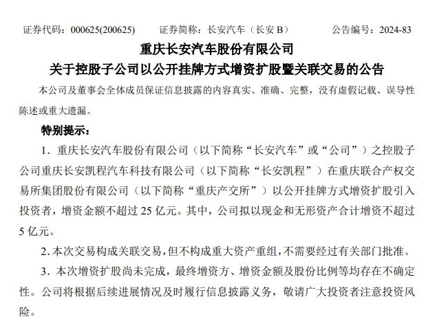 根據(jù)公告中顯示,長(zhǎng)安凱程將在重慶聯(lián)合產(chǎn)權(quán)交易所通過(guò)公開掛牌方式增資擴(kuò)股,引入不超過(guò)25億元的資金。長(zhǎng)安汽車計(jì)劃以現(xiàn)金和無(wú)形資產(chǎn)相結(jié)合的方式,對(duì)長(zhǎng)安凱程增資不超過(guò)5億元。
