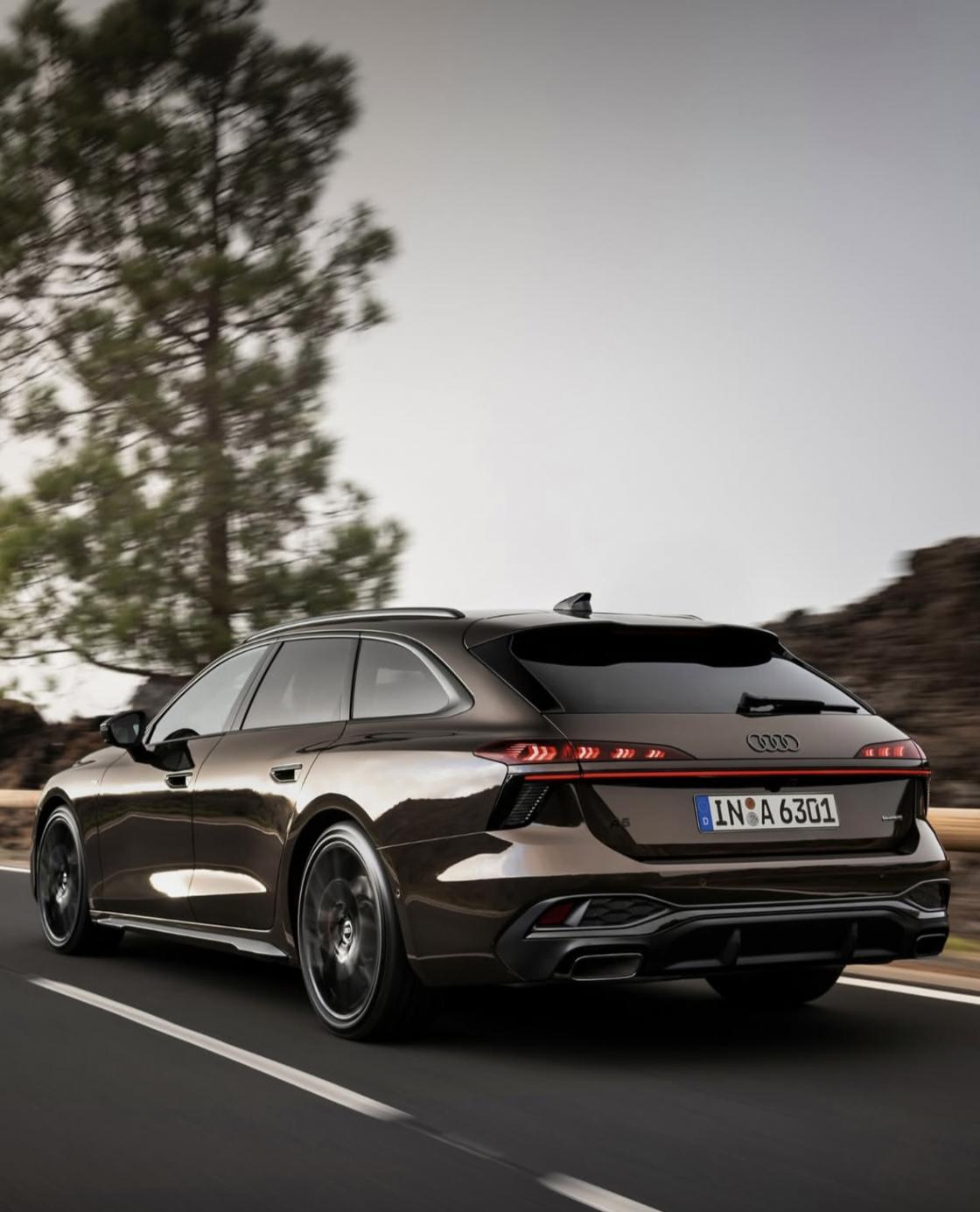 新車保留了奧迪標志性的六邊形中網,但通過黑化處理和可編程日行燈實現個性化表達,矩陣式光源支持動態圖案切換,兩側導流槽兼具空氣動力學與視覺沖擊力。側面修長線條搭配22英寸熏黑輪轂,D柱前傾角度增加至15°,風阻系數降至0.25,成為歷代最“滑”的A6旅行車。尾部貫穿式尾燈采用雙層鱗片光源,與熏黑擴散器共同演繹“西裝暴徒”美學。