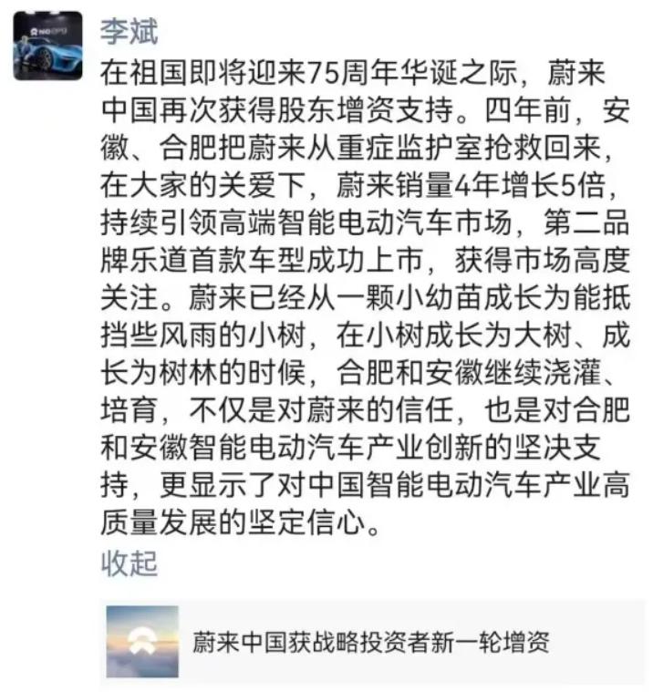 李斌寫道:“在祖國即將迎來75周年華誕之際,蔚來中國再次獲得股東增資支持。四年前,安徽、合肥把蔚來從重癥監護室搶救回來,在大家的關愛下,蔚來銷量4年增長5倍,持續引領高端智能電動汽車市場,第二品牌樂道首款車型成功上市,獲得市場高度關注。蔚來已經從一顆小幼苗成長為能抵擋些風雨的小樹,在小樹成長為大樹、成長為樹林的時候,合肥和安徽繼續澆灌、培育,不僅是對蔚來的信任,也是對合肥和安徽智能電動汽車產業創新的堅決支持,更顯示了對中國智能電動汽車產業高質量發展的堅定信心。”