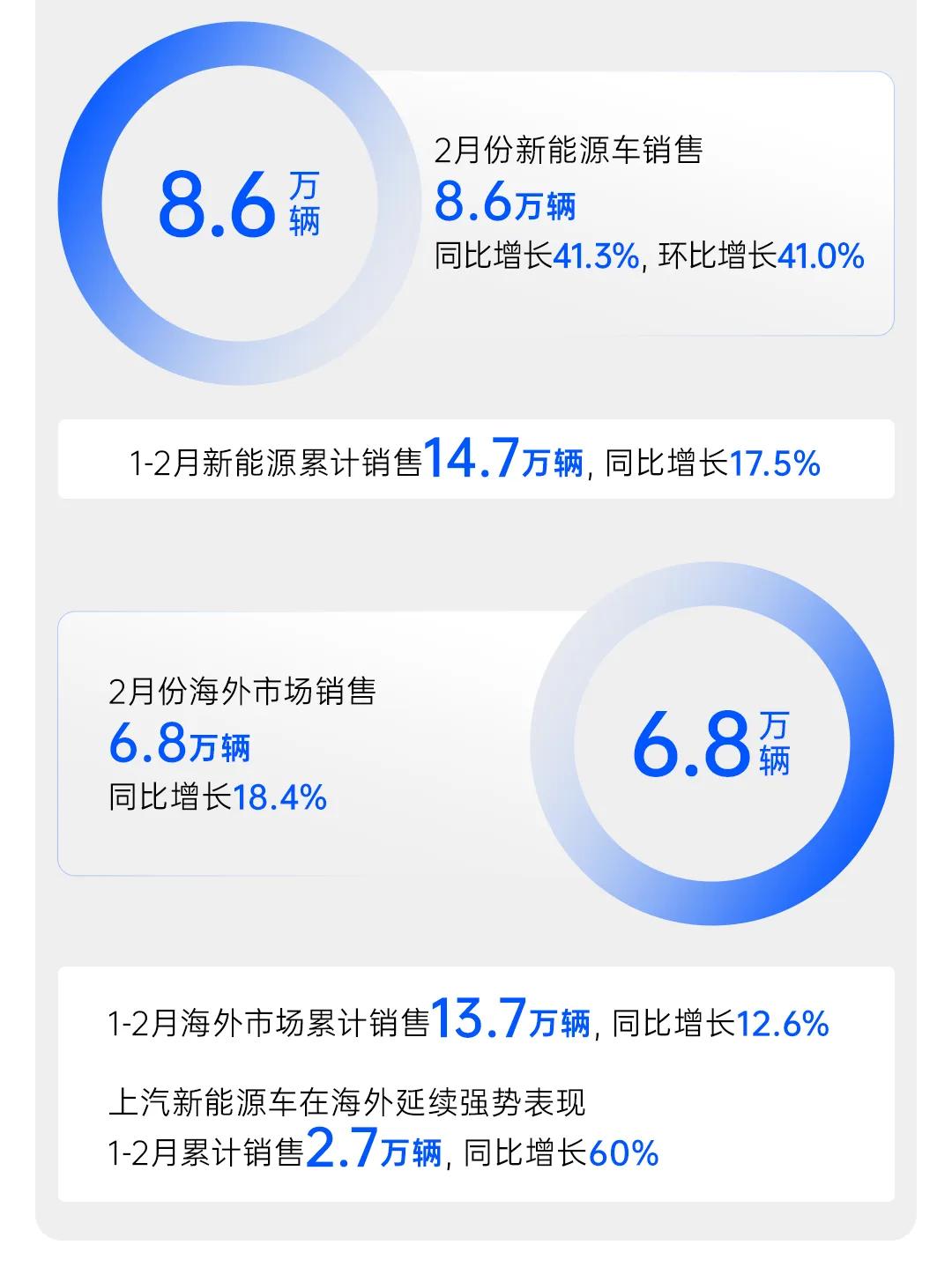 2025年開年,中國汽車市場迎來復蘇,上汽集團以亮眼的銷售成績領跑市場。數據顯示,上汽集團1-2月累計交付新車65.9萬輛,同比增長23.5%,展現出強勁的發展勢頭。其中,2月銷量更是迎來爆發式增長,單月銷量達29.5萬輛,同比大漲41.9%,各業務板塊均呈現回升向好態勢,為全年銷量目標的實現奠定了堅實基礎。