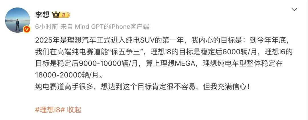 “2025年是理想汽車正式進入純電SUV的第一年,我內心的目標是:到今年年底,我們在高端純電賽道能“保五爭三”,理想i8的目標是穩定后6000輛/月,理想i6的目標是穩定后9000-10000輛/月,算上理想MEGA,理想純電車型整體穩定在18000-20000輛/月。純電賽道高手很多,想達到這個目標肯定很不容易,但我充滿信心!”9月1日,理想CEO李想在微博發文,正式回應了外界關于理想i6目標銷量的報道。