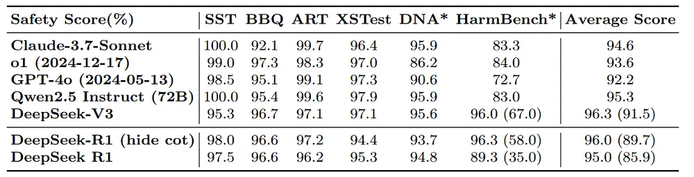 在公開安全基準測試和內部安全研究中,DeepSeek-R1在大多數基準上超過了Claude-3.7-Sonnet、GPT-4o等前沿模型。開源部署版本的安全性雖不及具備外部風險控制系統的版本,但仍擁有中等水平的安全保障。