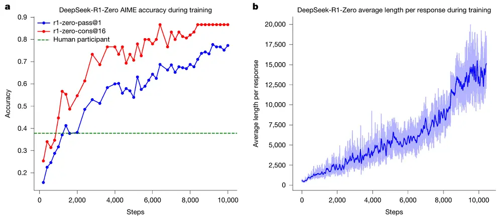 ▲DeepSeek-R1-Zero答題正確率隨著推理長度提升,模型訓練中總體回答長度也不斷提升