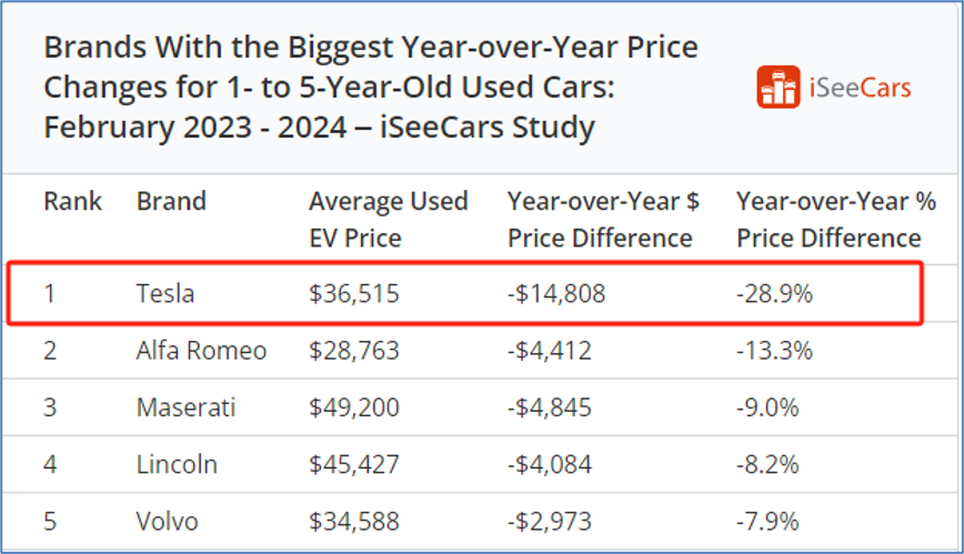 這份報(bào)告的數(shù)據(jù)顯示,過去一年時(shí)間里,特斯拉美國(guó)市場(chǎng)上的平均二手車價(jià)格從51232美元跌至36515美元,降幅高達(dá)28.9%,是美國(guó)市場(chǎng)上貶值幅度最大的品牌。