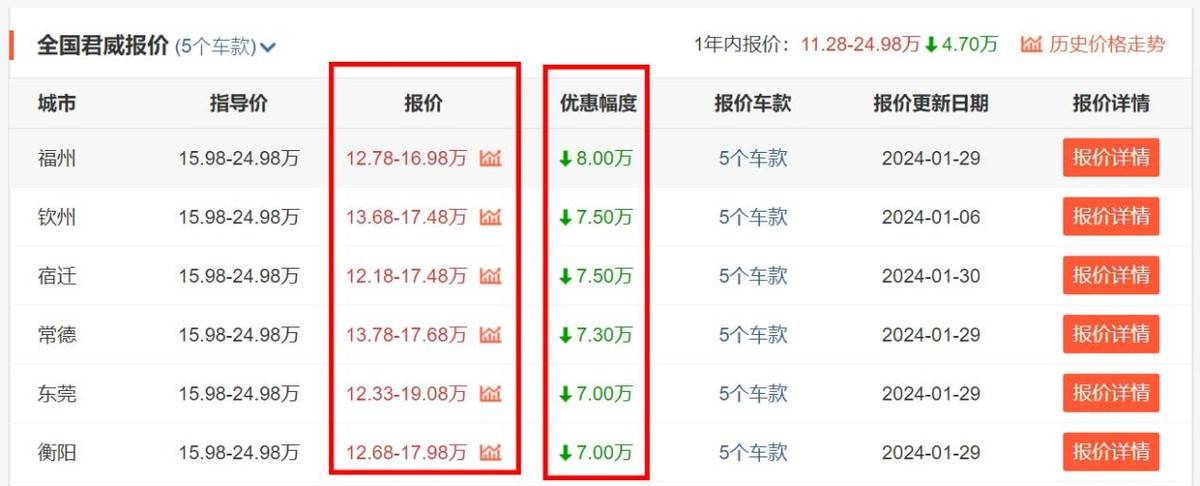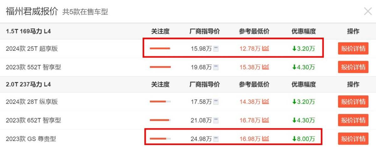 具體來看,別克君威的指導價在15.98-24.98萬元區間,但眼下在許多地區的經銷商那里,其最低價也已經來到了12.78-16.98萬元區間。我們就以福州地區舉例來說吧,原價15.98萬的2024款君威車型最低配,現在其參考的最低價便已經來到了12.78萬元區間,而終端優惠則是能達到3.2萬元之多,怎么樣,是不是很便宜?